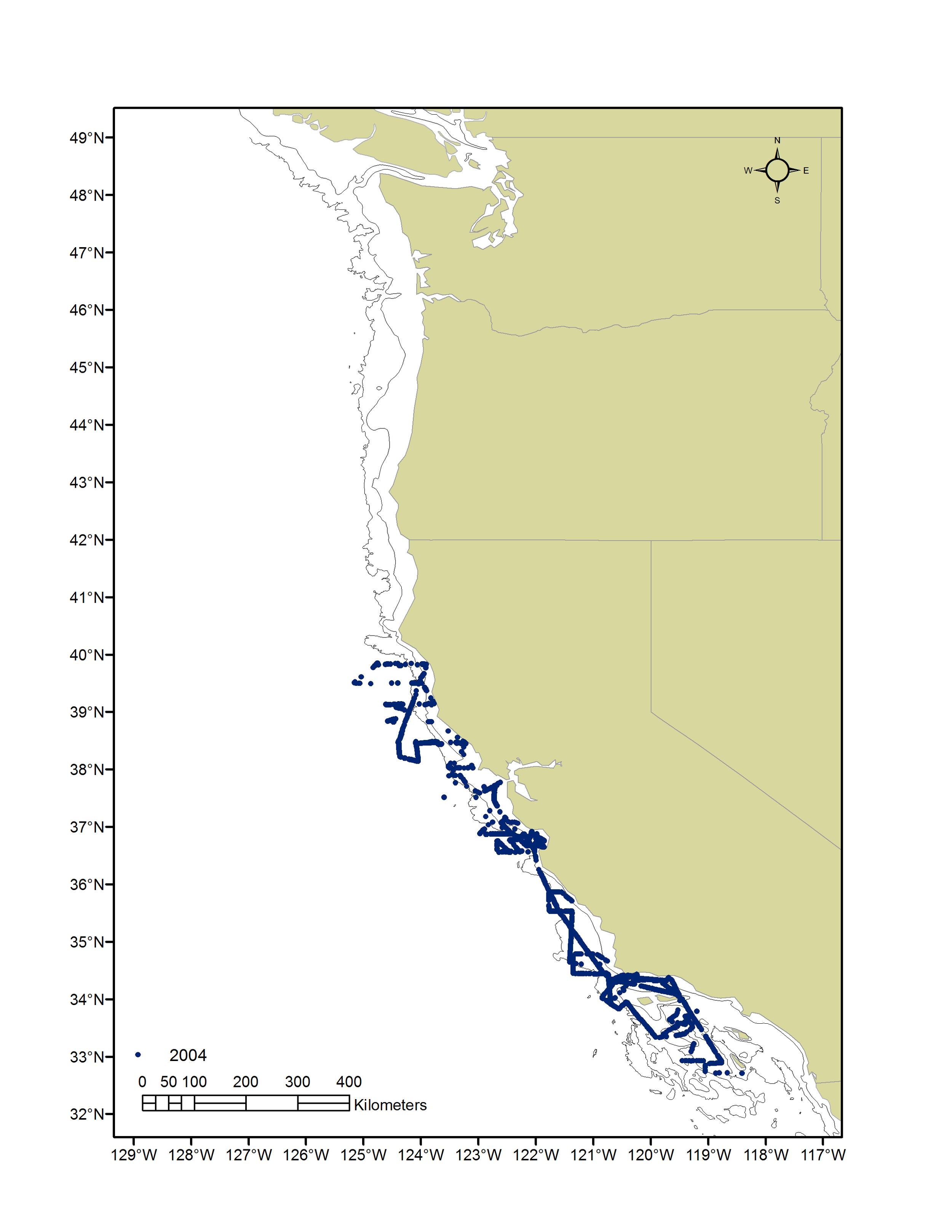 Juvenile Rockfish Survey (JRS) 2004- collected data from May 05, 2004 to June 10, 2004 sampling 1,258 nmi of ocean habitat. JRS samples hydrographic conditions, zooplankton (including krill) and young of the year (YOY) rockfish (Sebastes spp.) and other micronekton using CTD casts, Tucker trawls, and mid-water trawls (MWT), respectively, at a series of stations along the continental shelf from southern to northern California (raw data courtesy of SWFSC: Sakuma et al. 2006, Field et al. 2010, Santora et al. 2012).
